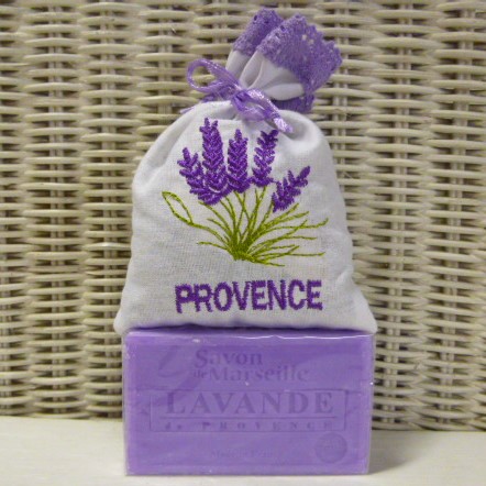 Levandulový dáreček z Provence obsahuje velký vonný pytlíček plněný sušenou levandulí z Provence a přírodní marseillské levandulové mýdlo 100g z Provence.