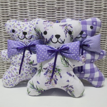 Medvídek je vyplněný polštářovou výplní jako měkký polštářek a levanduli má v mašličce, po promačkání se krásně rozvoní. Mašličku lze jednoduše sundat a medvídka vyprat.